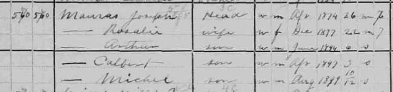 US Census of 1900 shows the young Mauras couple in their 20s with two children living at home. Here, they show him as just Joseph.