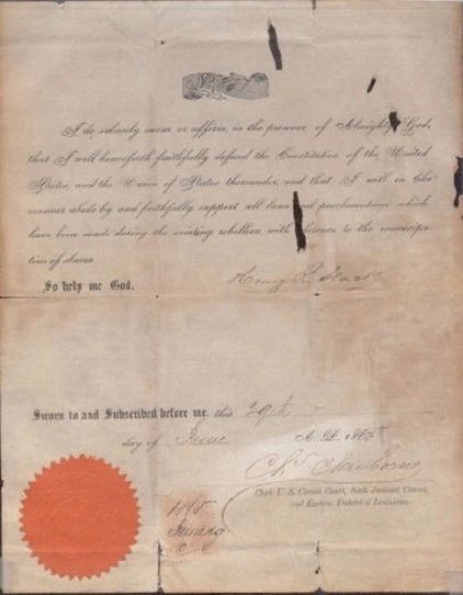 Confederate Army in the Civil War. He was a cavalryman with Company C, lst Louisiana Cavalry, CSA. Federal Rolls of Prisoners of War, Captured Alexandria, La., Feb. 2, 1864. Recd. Camp Dougias, Chicago, Ill., March 7, 1864. Remarks: Claims to have been loyal. En. to avoid conscription. Was captured and desires to take the Oath of Allegiance (see sample below). Name appears as a signature to an Oath of Allegiance to the United States subscribed and sworn to at (date and place not stated). Res. Moxville, La., complexion fair, hair brown, eyes gray, height 5 ft 8 in. Endorsement shows: Roll of Prisoners of War, released May 17, 1865.