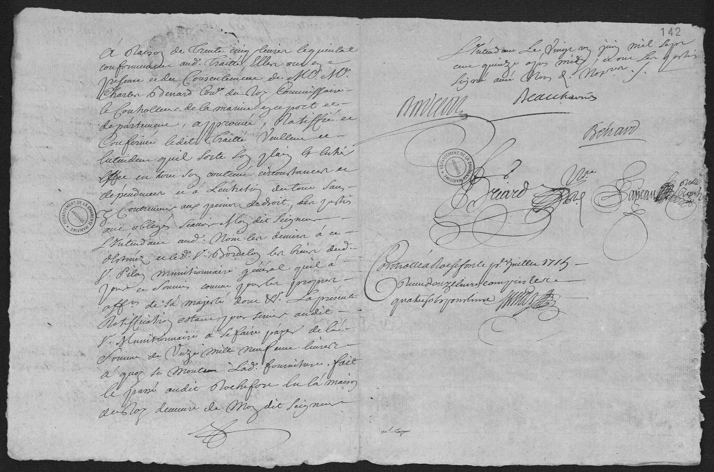 Ratification of the treaty passed under private signature on April 1, 1714, between Francois de Beauharnois, Intendant of Rochefort, and Thomas Bordelon, Director of the Supplies/Rations of the Navy, for the supply of three hundred and forty quintals bacon salted without foot nor head, intended for the new establishment that the King makes with I'le Royal Island