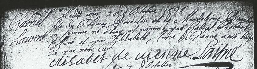 Jean Baptiste Thomas BORDELON was likely born about 1670. It is now known that he signed (what is believed to be) a marriage contract on 13 October 1690 with Madeleine Richouf de Champgautiers. Reference to this contract is based on a small excerpt in the records of the Archives départementales of Charente-Inférieure which appear to be part of the couple's separation/divorce judgement.