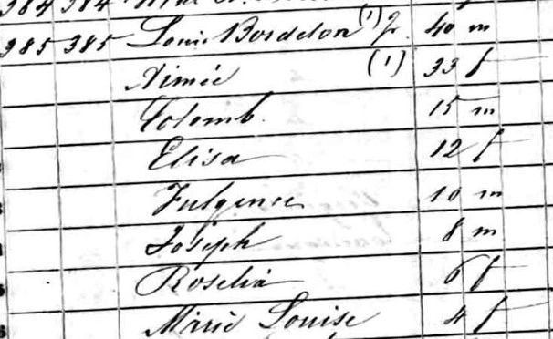 Louis owned 1 (16yo) female, and his mother (widow Zenon Bordelon) owned 3 - ages 25, 3 and 2.