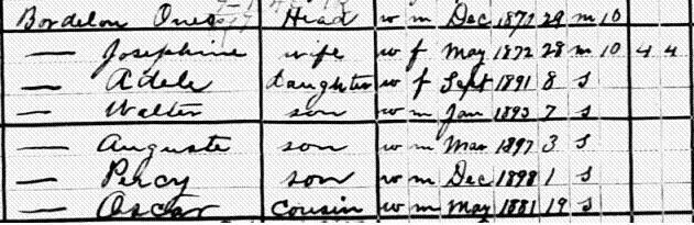 1900 Census shows Ones and Josphanie at home with all of their kids. Here, both of their birthdays are mistaken, which was common during these times. The death certificate below clearly shows different dates. I never understood how they came up with these dates. Oscar, a cousin, was also living with them.