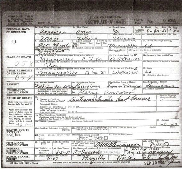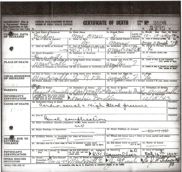 Death: 15 OCT 1942 10:00 PM in Marksville, Avoyelles.